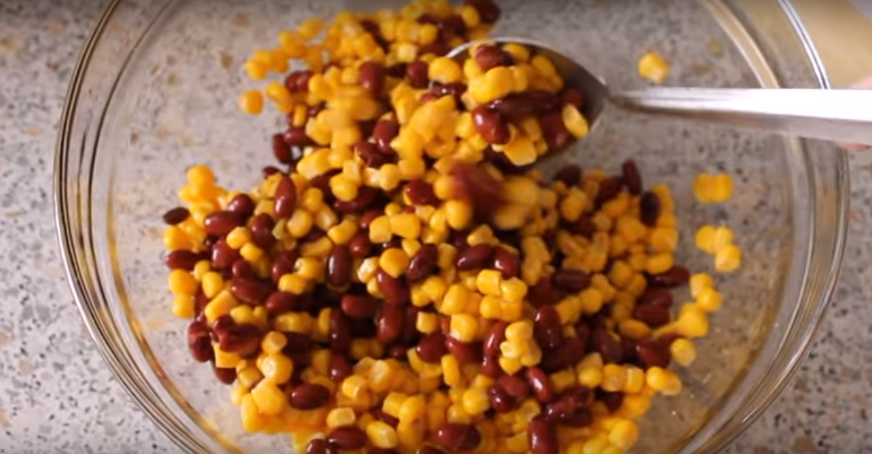 Фасоль и кукурузу высыпаем в дуршлаг, проливаем горячей водой и выкладываем в тарелку.