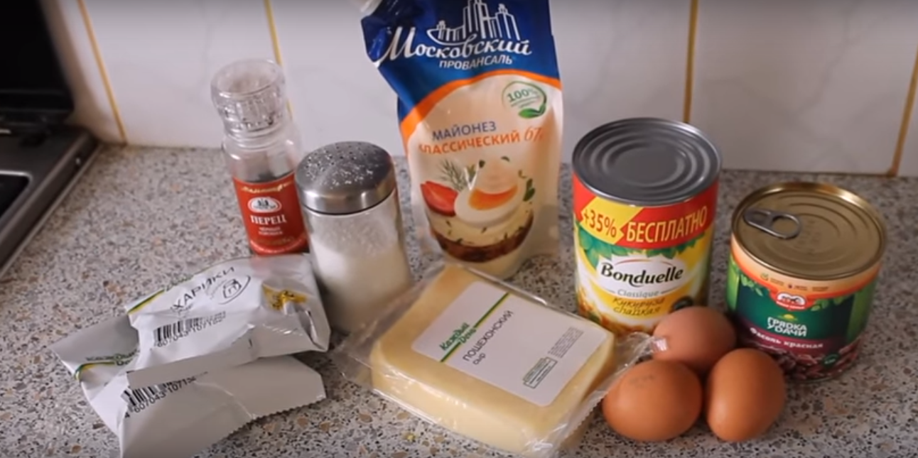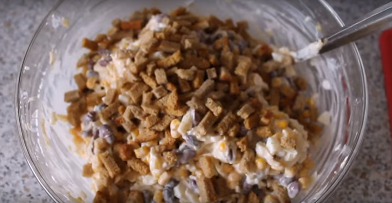 Салат с фасолью, чесноком, сухариками и консервированной кукурузой