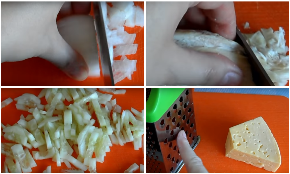 - Куриное мясо нарезать тонкой соломкой.