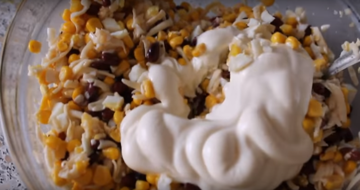 После добавления майонеза ингредиенты следует аккуратно перемешать и подать к столу.