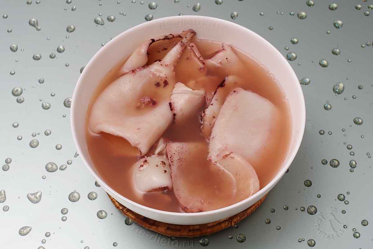 Какой бы вариант чистки вы ни использовали, перед варкой тушки кальмаров нужно хорошо промыть прохладной проточной водой снаружи и внутри, после чего можно сразу же приступать к следующему этапу.