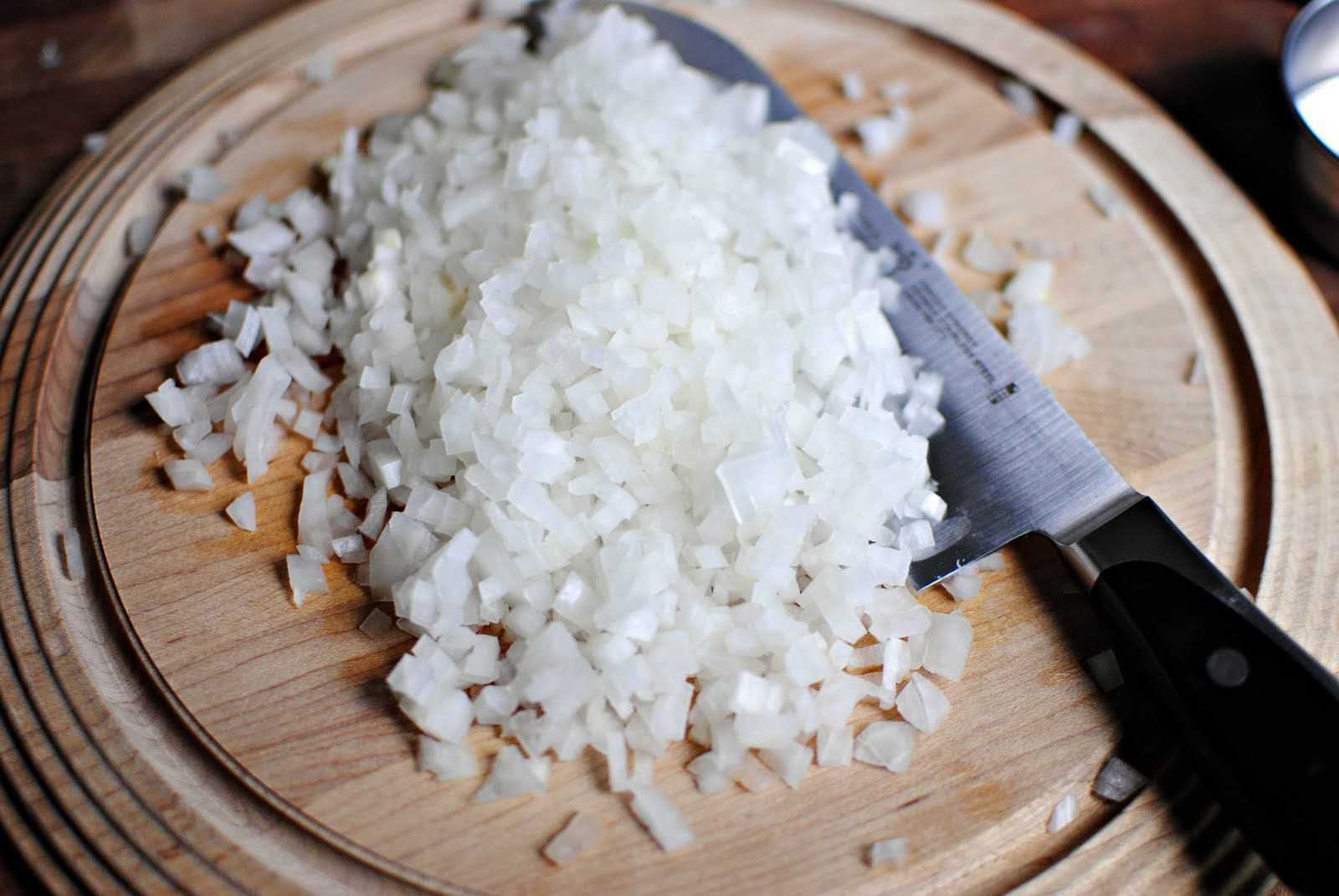 лука. Его необходимо почистить и мелко порезать кубиками.