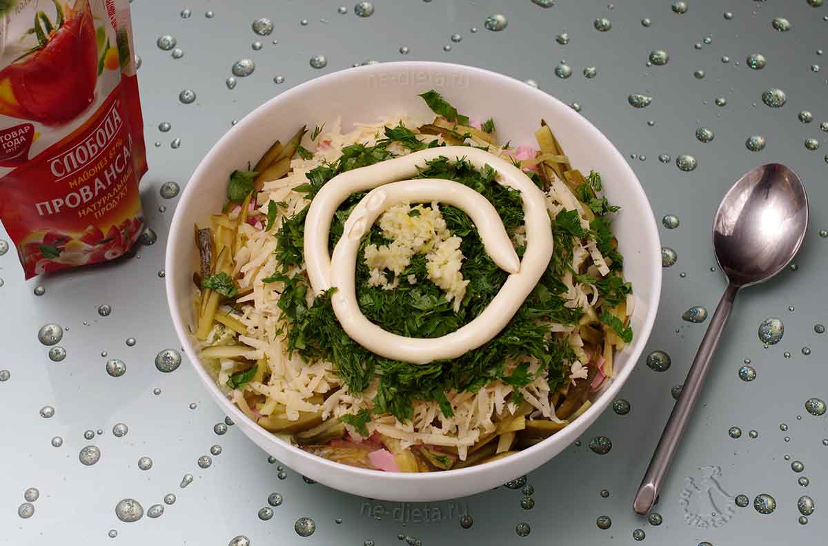 Важно! Заправляйте этот салат майонезом непосредственно перед подачей, тогда в нем не образуется лишняя жидкость и он будет выглядеть очень аппетитно и свежо.