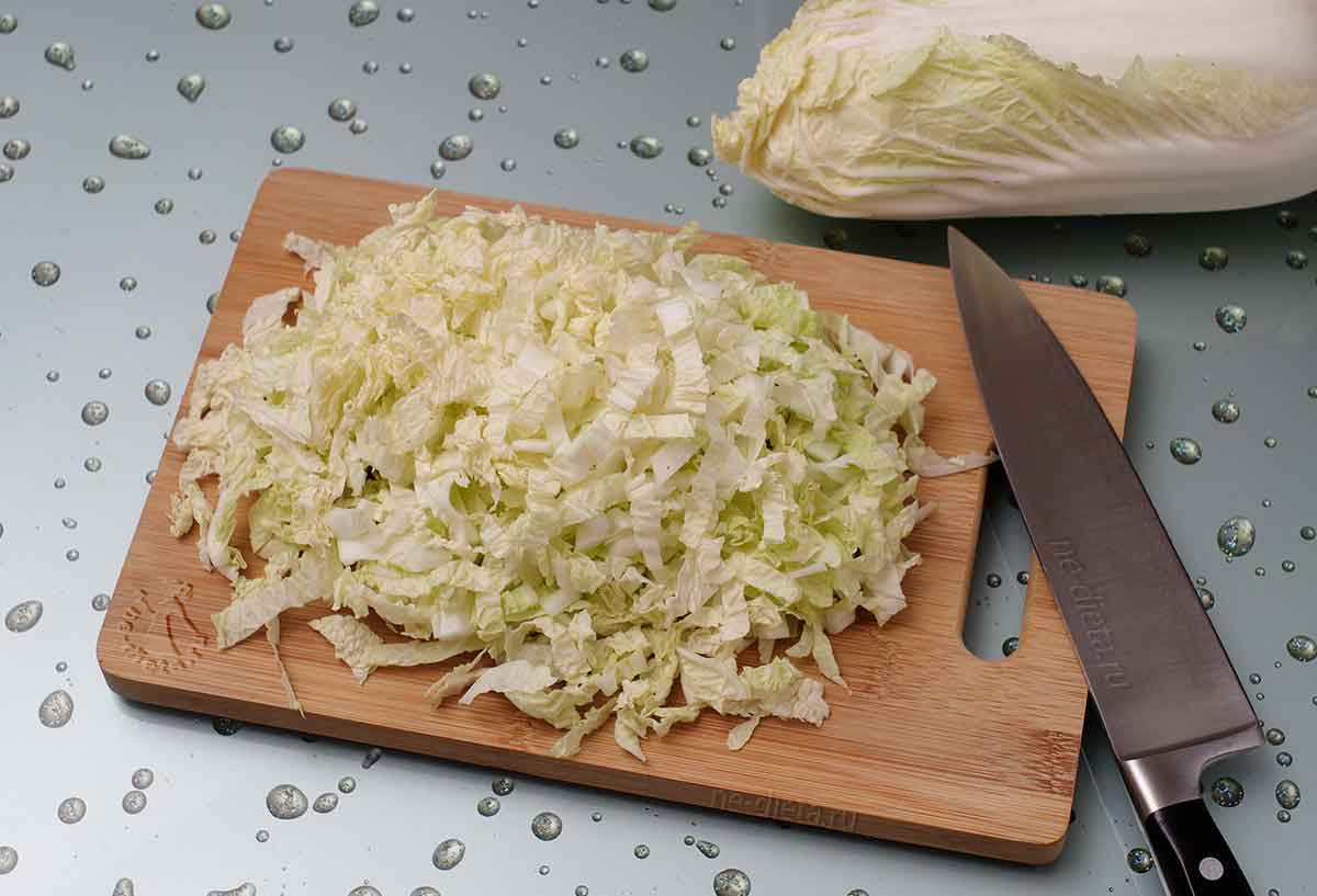 - Тонкими, недлинными полосами шинкуют заранее промытую и просушенную пекинскую капусту.