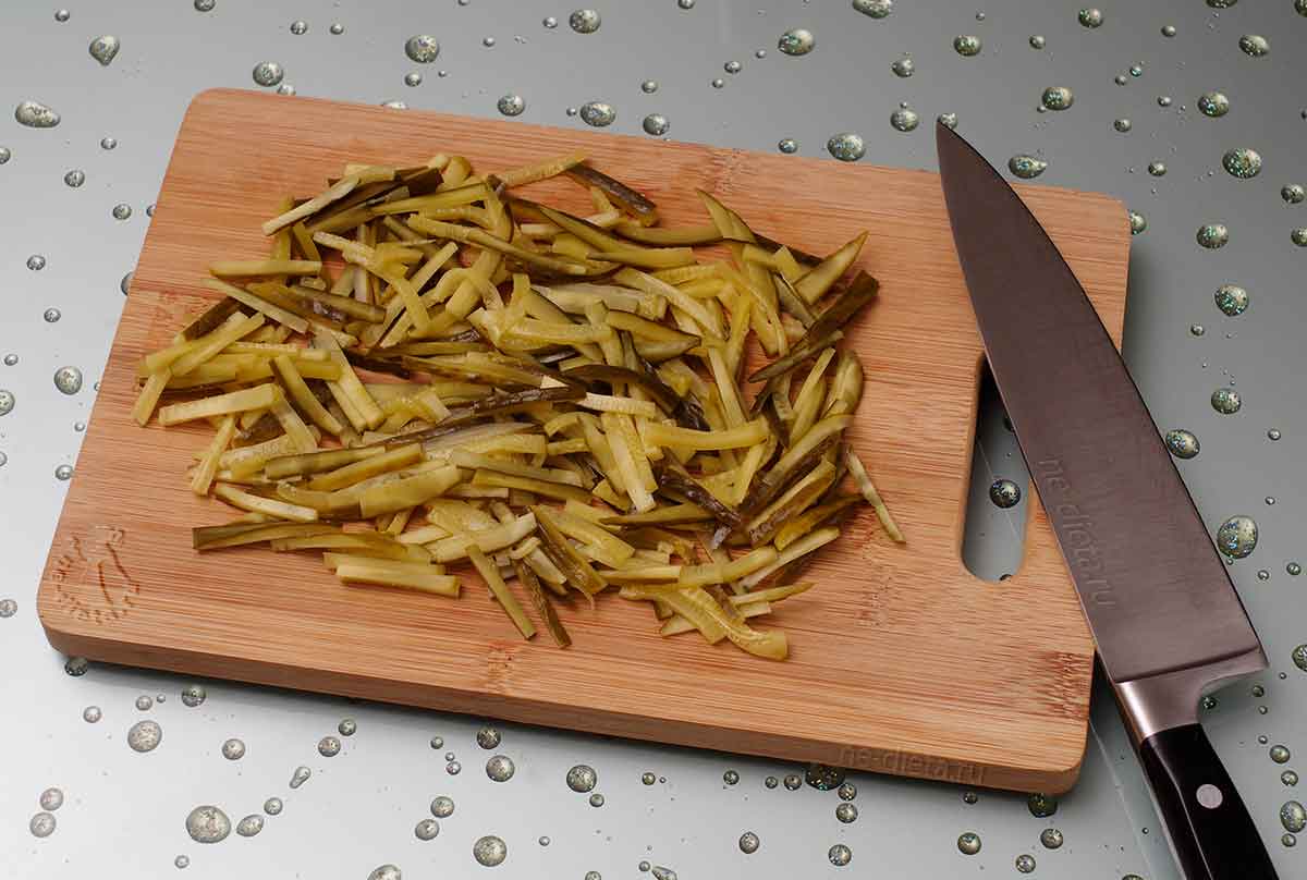 3. Маринованные огурцы также порезать длинной тонкой соломкой. Удобнее использовать полноразмерные маринованные огурчики, а не корнишоны, так как нарезка последних займет гораздо больше времени.