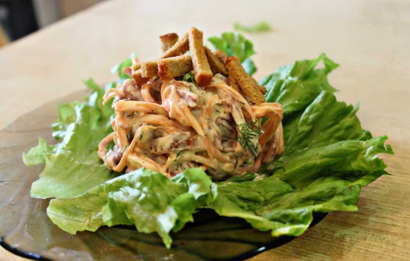 За 3 минуты до подачи засыпьте сухари и тщательно размешайте. При необходимости снова добавьте майонез.