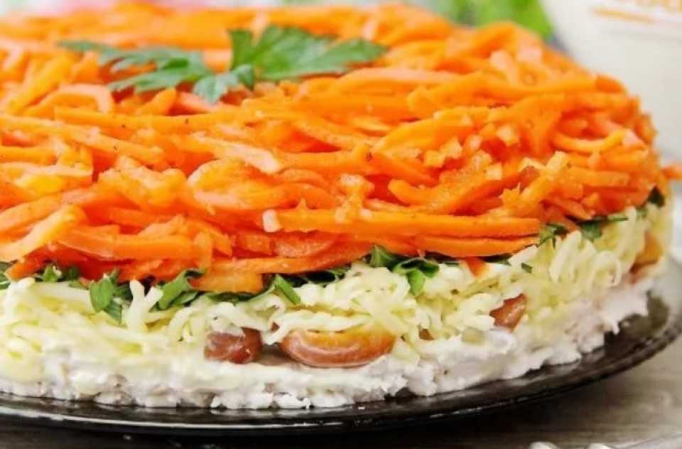 Слоеный салат из моркови по корейски с копченой курицей и кукурузой
