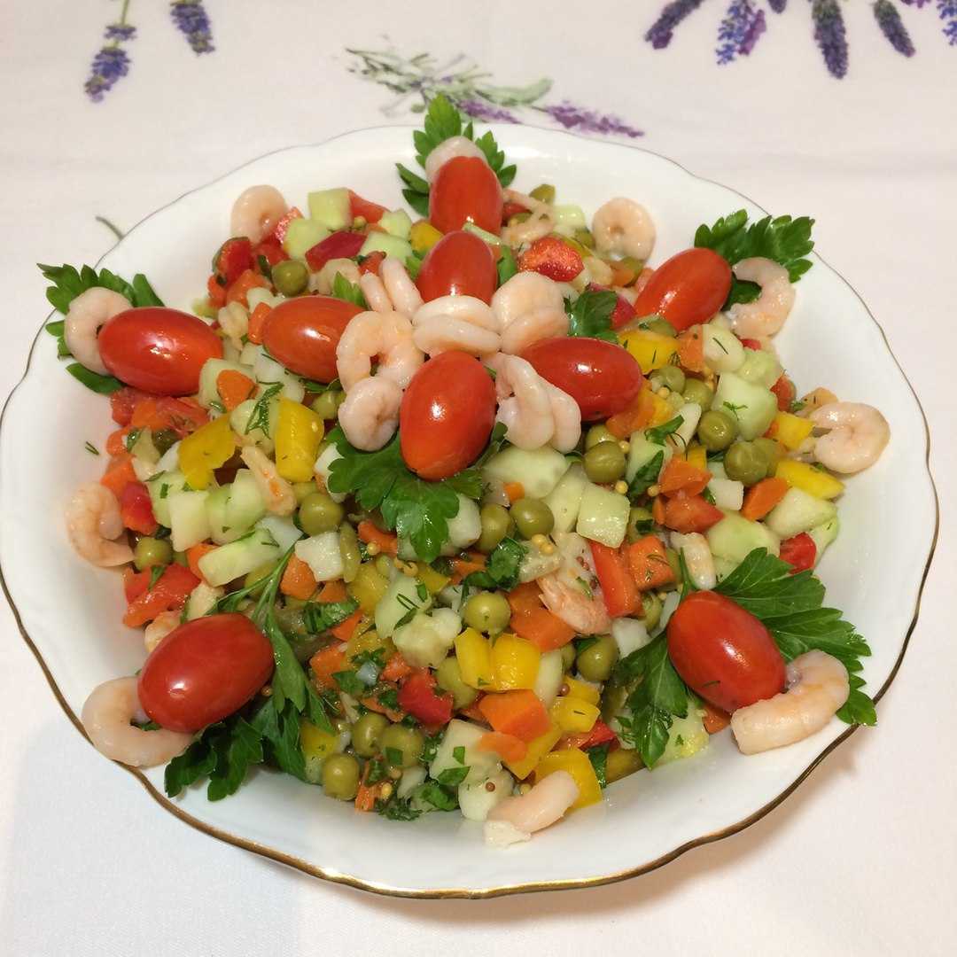 Салат с креветками, огурцом, помидорами
