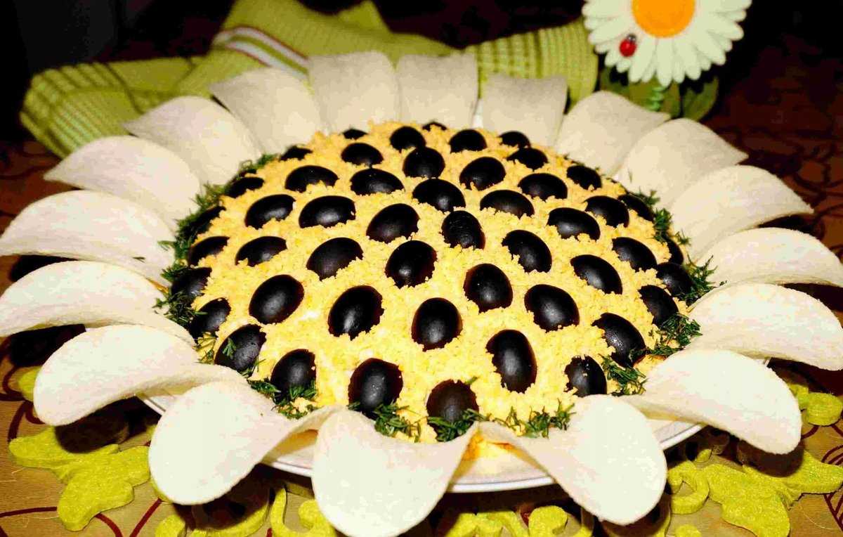 Последним слоем салата будут желтки. Измельчите их на мелкой терке. Равномерно распределите по всей поверхности салата. Далее маслины порежьте пополам. Разложите их на поверхности салата. С краев кругом выложите чипсы.