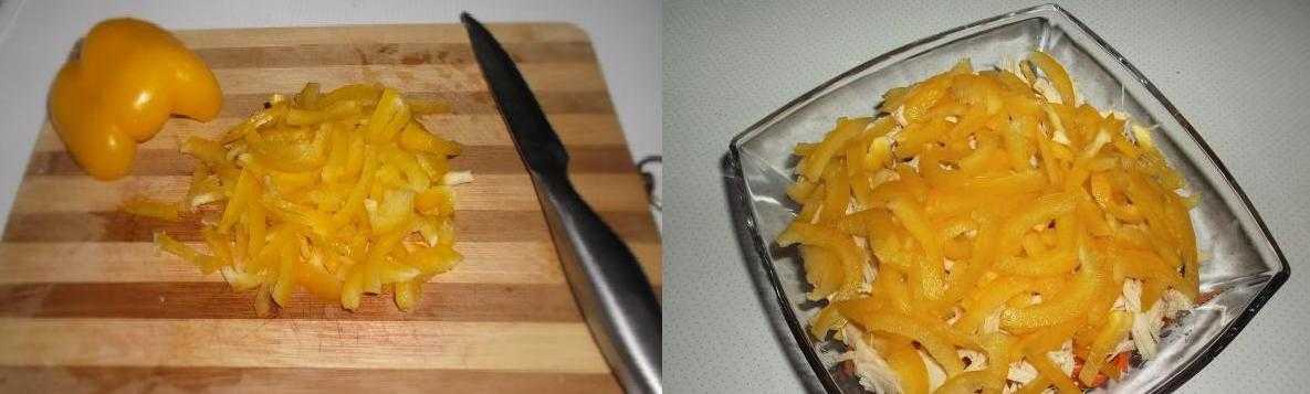 2. Далее перец болгарский, лучше брать желтого цвета он насыщеннее и ярче смотрится. Порубите его на тонкие полосочки.