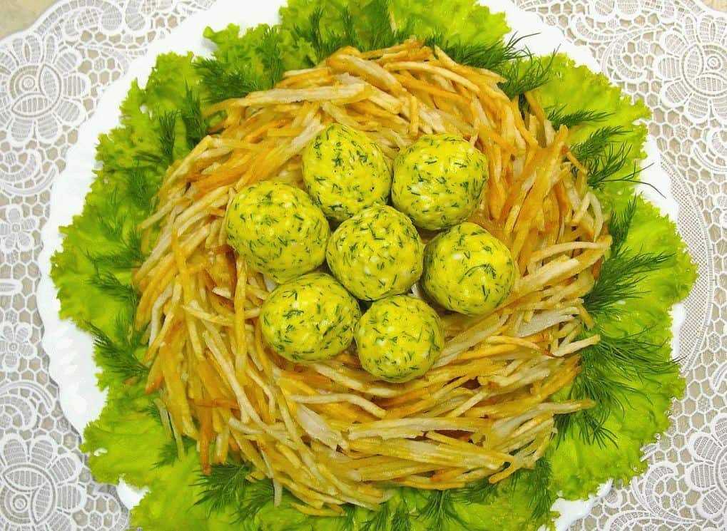 «Гнездо глухаря» − салат очень вкусный, но с его приготовлением придется «повозиться». Также для его приготовления понадобится много продуктов. Помимо куриных яиц авторы рецепта рекомендуют еще добавлять и перепелиные, которые сверху украсят блюдо. Отварная грудка курицы – один из главных ингредиентов, придающий сытность готовому блюду. В качестве дополнительных продуктов используются отварной картофель, репчатый лучок, требующий предварительной пережарки, морковь по-корейски, соленые огурчики, сыр твердого сыра, петрушка и листовой салат. Выкладывают все продукты послойно, формируя из них гнездо, которое сверху посыпают сыром, по краям зеленью петрушки, а посередине помещают перепелиные яички.