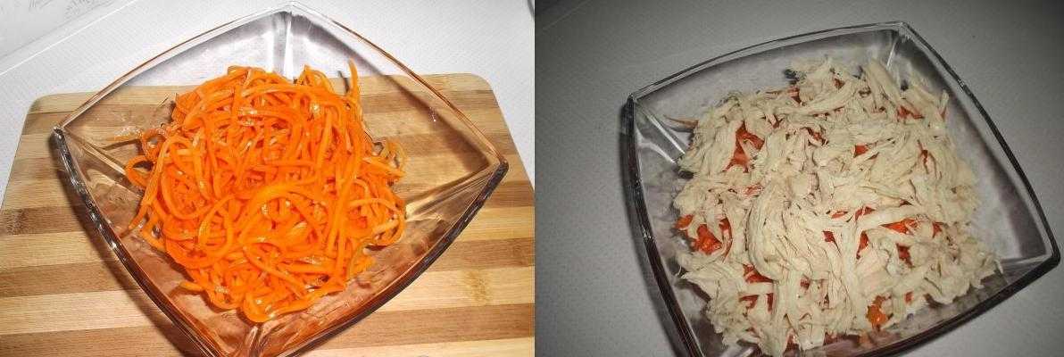 1. У меня была уже готовая корейская морковка вы можете такую изготовить сами или же купить в магазине. Итак, выложите ее в миску, затем уложите куриное мяско вареное, его нужно будет порвать руками на кусочки.