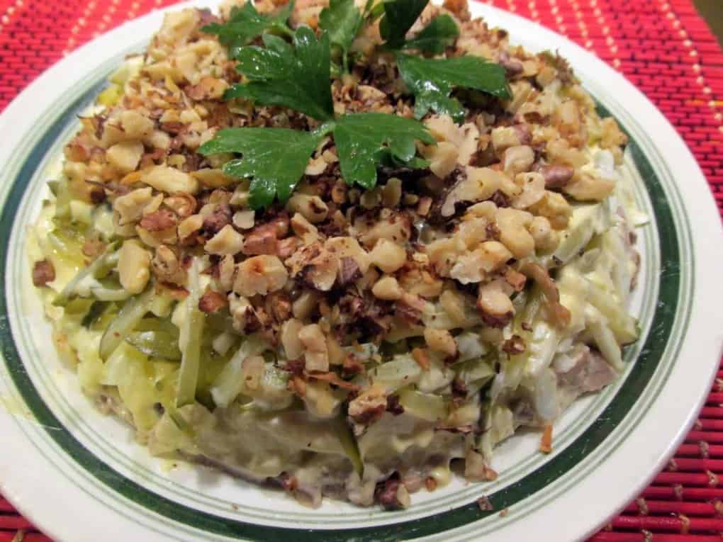 Праздничный салат из курицы с черносливом и грецкими орехами