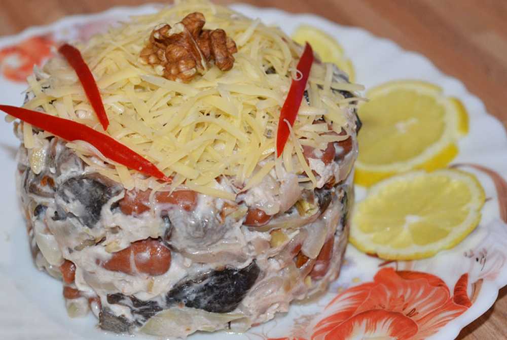 Обычный салат с курицей и грибами, дополненный маринованной, красной фасолью, обычно расхватывается в первую очередь. Все дело в правильно подобранных ингредиентах, которые отлично гармонируют между собой, создавая настоящий кулинарный шедевр. Все дело в том, что продукты сопоставлены в правильной пропорции, отсюда основным продуктом будет являться куриное филе, затем будет чувствоваться грибной привкус, а уж фасоль отходит на второстепенное, но в то же время, главное место.