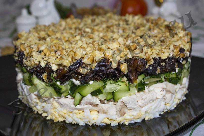 Рецепт 3: салат «Галатея» (салат с отварной курицей, грецкими орехами и черносливом)