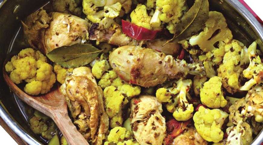 Вариант простого, быстрого и диетического блюда из курицы с цветной капустой в духовке. Вкус будет напрямую зависеть от используемых специй. Также в блюдо добавляется картофель, при необходимости этот ингредиент можно исключить.