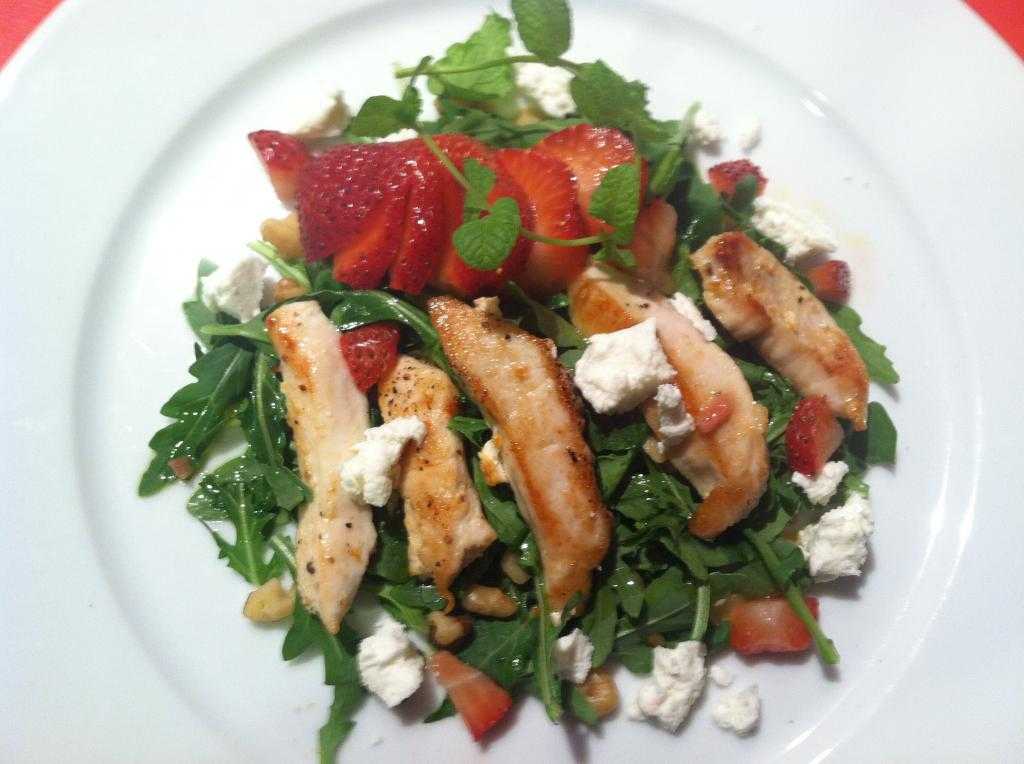 - На тарелку разложить листья рукколы (50 г) и кусочки куриной грудки (300 г).