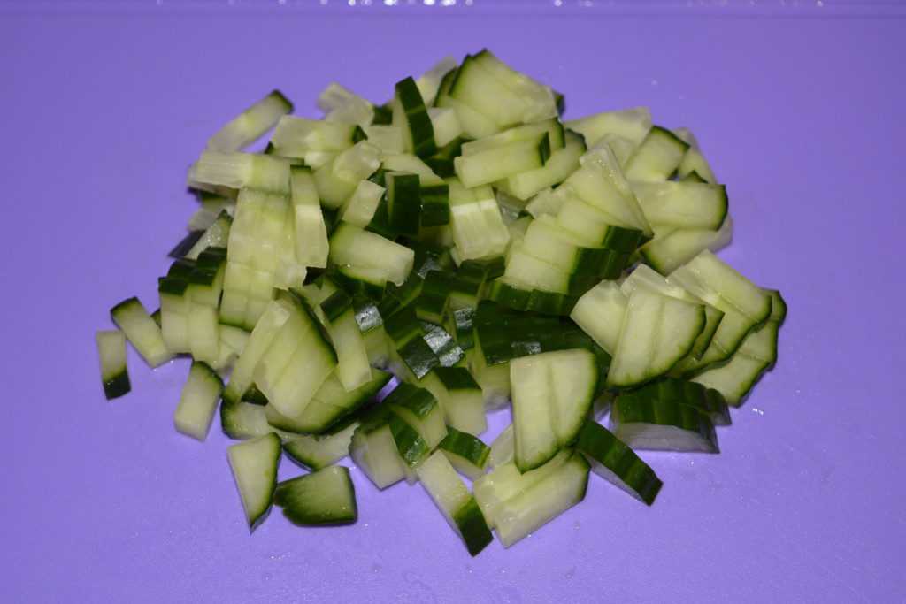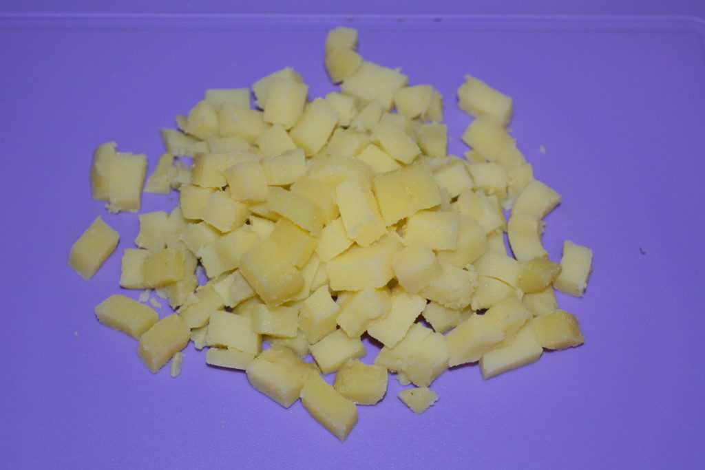 Яйца сварить вкрутую в солёной воде, очистить и нарезать кубиками.