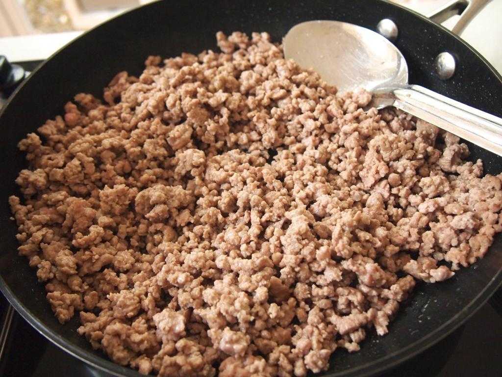 - Обжарить фарш с луком на растительном масле, посолив и поперчив по вкусу.