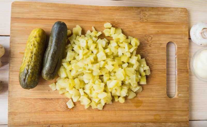 Лук очистить, измельчить и замочить в растворе (уксус + вода + сахар) на 15 мин, затем отжать его руками. Тем временем порезать кубиками маринованные грибы и вместе с луком отправить в общую посуду.