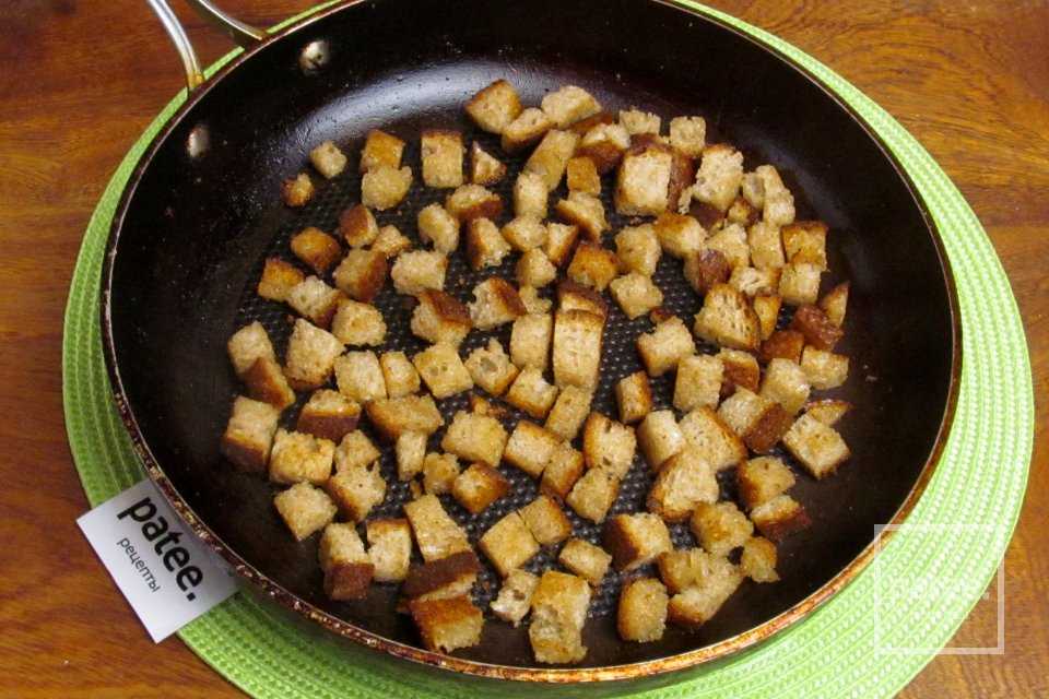 Обжариваем на подсолнечном рафинированном масле хлеб до получения румяных сухариков.