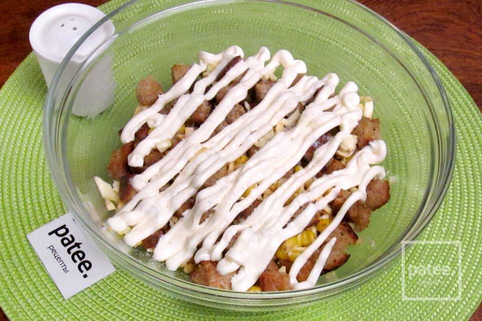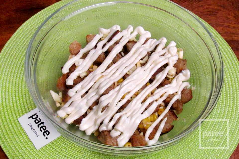 - Блюдо оформить слоями, подсолить и полить майонезным соусом: