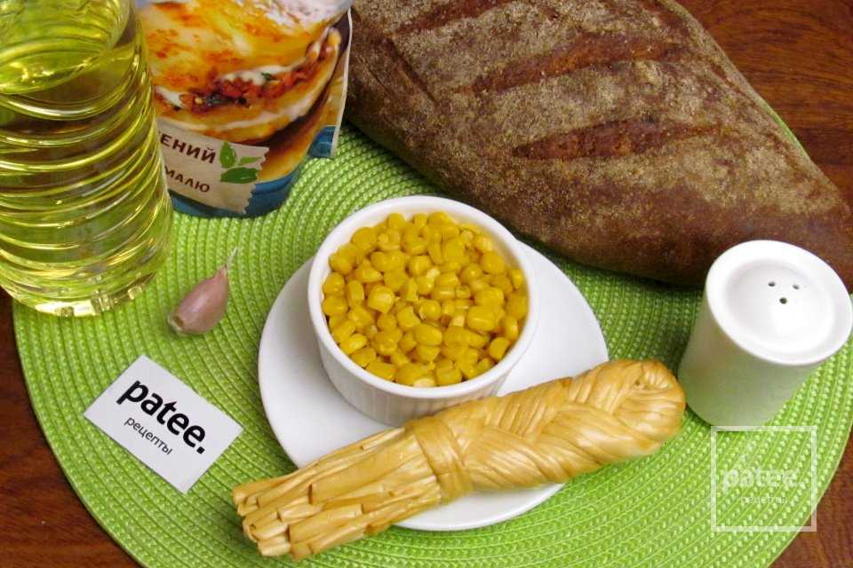 Для приготовления салата с сухариками и сыром косичка нам понадобятся следующие ингредиенты: консервированная кукуруза, сыр копчёный косичка, хлеб ржаной, чеснок, майонез, масло подсолнечное рафинированное, соль, чёрный молотый перец.
