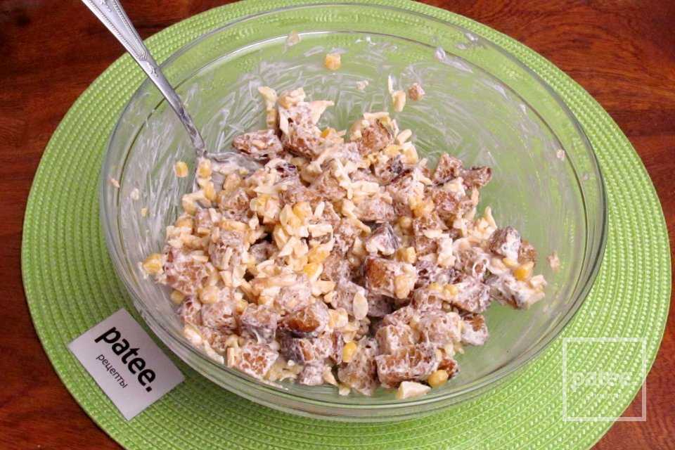 Салат перемешиваем. Салат с копчёным сыром, сухариками и кукурузой готов.
