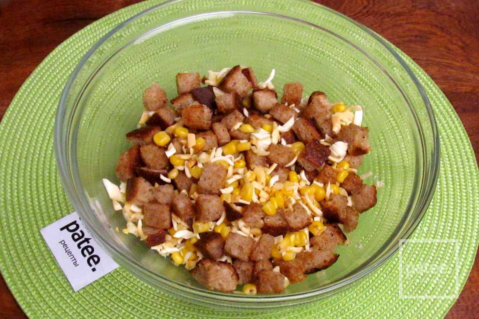 Подавайте салат с сухариками и сыром косичка сразу после приготовления, чтобы сухарики не успели размокнуть от майонеза.