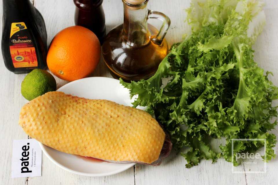 Для приготовления шикарного праздничного салата нам понадобятся такие ингредиенты: салат листовой (в принципе, любой зелёный, по вашему вкусу, в данном случае используется салат фризе), утиная грудка (достаточно большая или две небольших), апельсин, лайм, оливковое масло, бальзамический уксус, соль, чёрный молотый перец.