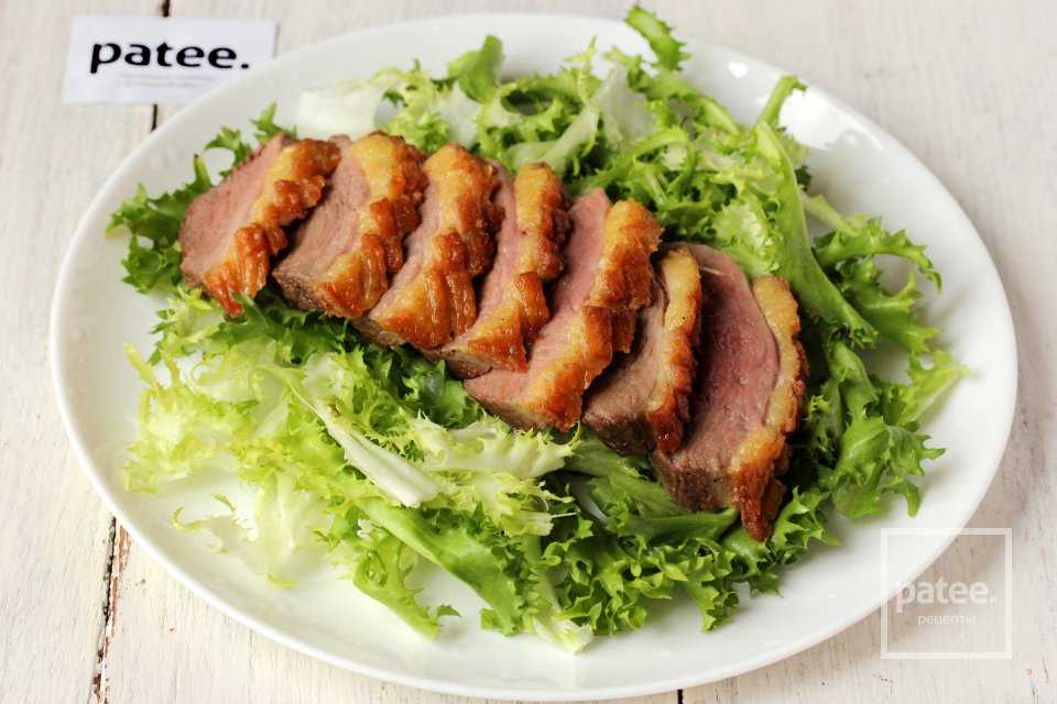 Поверх листьев салата выкладываем ломтики утиной грудки.