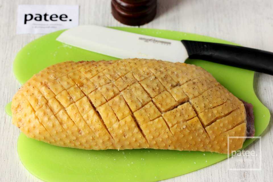 Утиную грудку поворачиваем кожей вверх и острым ножом делаем на коже прорезы в виде решётки. Кожа должна быть прорезана почти полностью, но мясо ни в коем случае не затрагивайте, к тому же решётка должна быть частой!