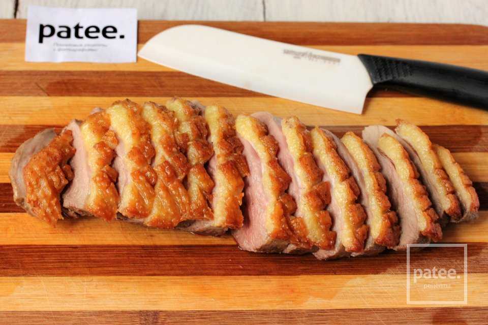 Достаём готовую утиную грудку из духовки и даём ей остыть до тёплого состояния.