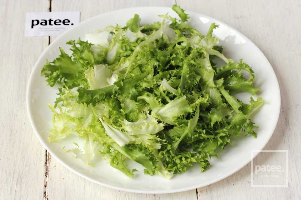 Салат фризе промываем, просушиваем и нарываем руками. Раскладываем в широкие плоские тарелки листья салата подушкой.