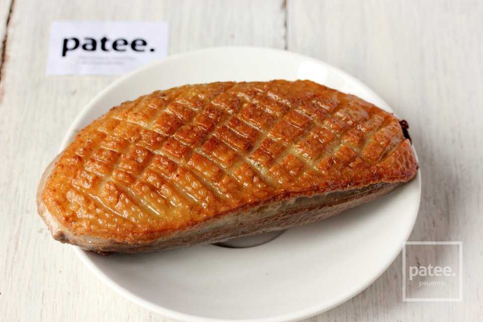 Затем утиную грудку переворачиваем и жарим ещё 3 минуты. Перекладываем утиную грудку на тарелку- как видите, корочка получилась идеальная!