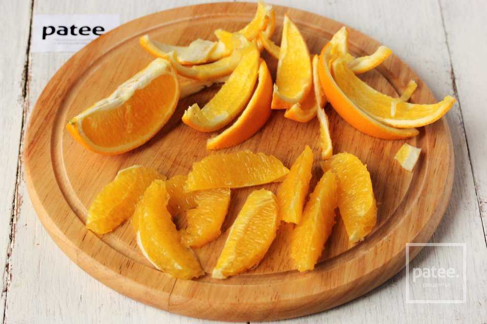 Апельсин моем, насухо вытираем, вырезаем апельсиновые дольки так, чтобы не затронуть белую часть кожуры. Косточки параллельно удаляем.