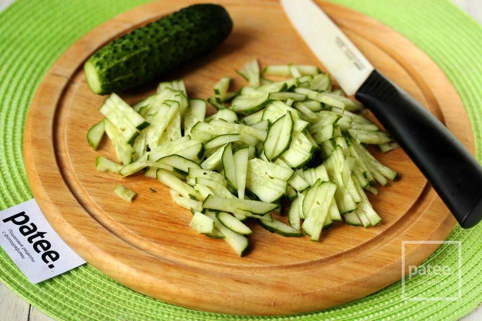 Свежие огурцы моем, обрезам края и нарезаем соломкой.
