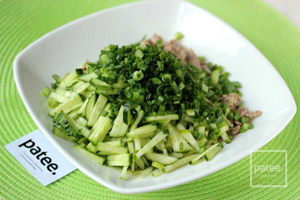Зелёный лук моем, просушиваем и нарезаем тонкими колечками. В миске или салатнике соединяем говядину, огурцы и лук.