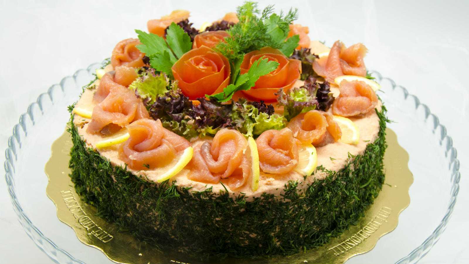 - Торт необходимо убрать в холодильник на 2-3 часа. За это время он станет более плотным. Достаём его из холодильника и перекладываем на блюдо, чтобы рыба стала верхним слоем. Украсить торт вы можете семенами кунжута. Сверху можно красиво разложить имбирь или лимон. Осталось только нарезать этот кулинарный шедевр и угостить им своих гостей.