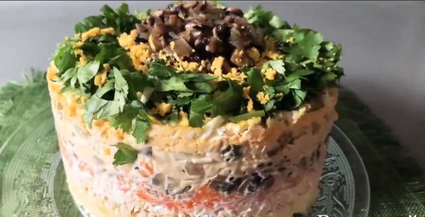 Советую взять шампиньоны, поскольку они быстро жарятся и времени на приготовление куриного салата уйдет немного. Салат выкладывается слоями, и красиво украшается, что невероятно симпатично смотрится среди праздничного угощения. Посмотрите для примера на фото. Если следите за весом – заправьте блюдо не майонезом, а натуральным йогуртом с нейтральным вкусом, к примеру, греческим.