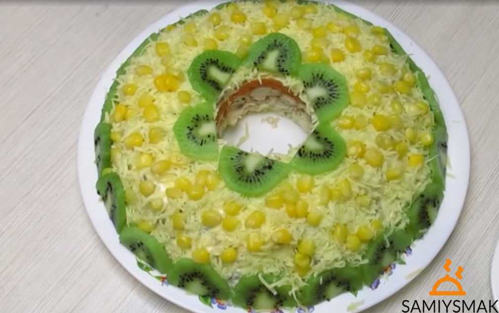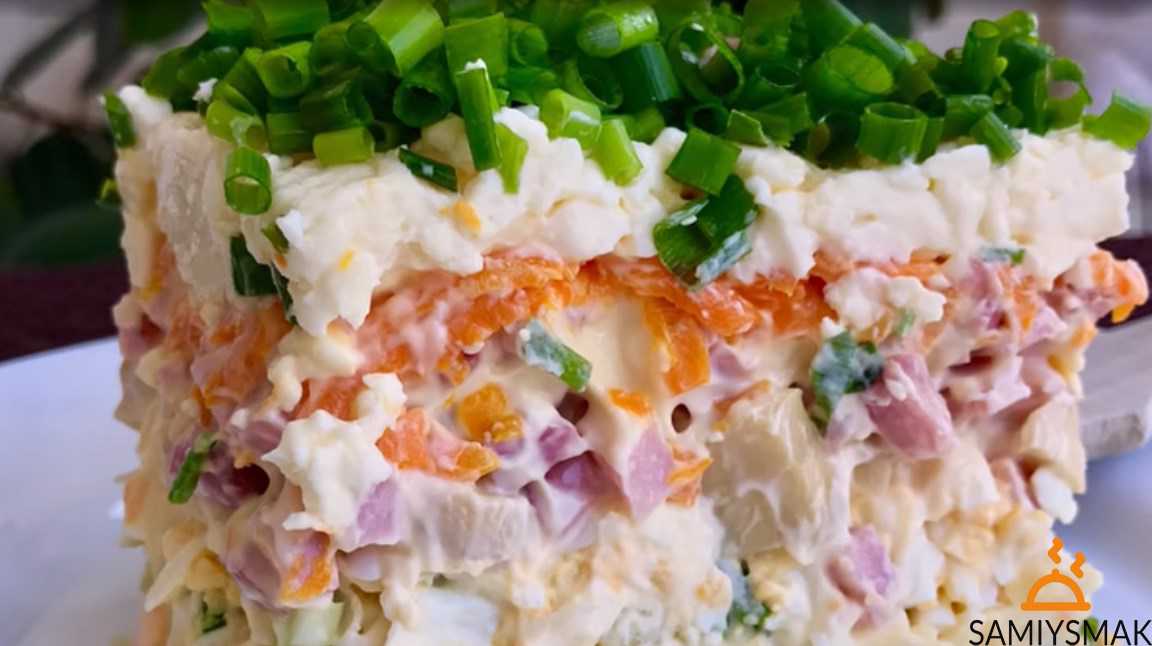 - Украсьте луком. Разрежьте салат, будто торт. Выложите порционные кусочки по тарелкам для гостей.