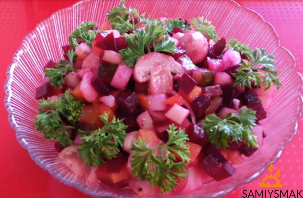 Вот еще один вариант салата со свеклой и редькой, но вкус закуски будет иной. Вместо соуса для заправки используется смесь растительного масла и уксуса. Секрет рецепта в том, что свекла почти не окрасит редьку.