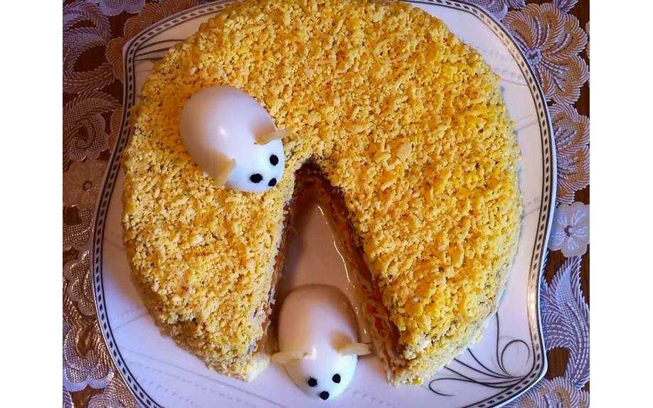 10.У отварных яиц отделите белки от желтков. Белок натрите на крупной терке и выложите на дно своей формы. Разровняйте и сделайте майонезную сеточку. Для этого соус положите в пакет и просто отрежьте уголок.