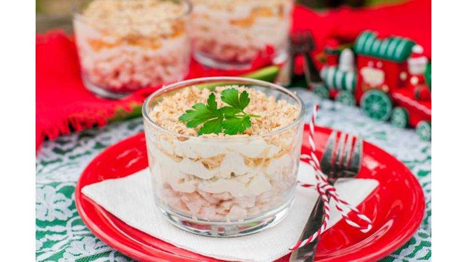 Если вы любите порционные виды салатов, которые можно подавать отдельно каждому гостю, тогда берите на вооружение этот рецепт. Только имейте в виду, что для подачи потребуются красивые прозрачные креманки или розетки, в которых будет хорошо просматриваться слоеная структура блюда.