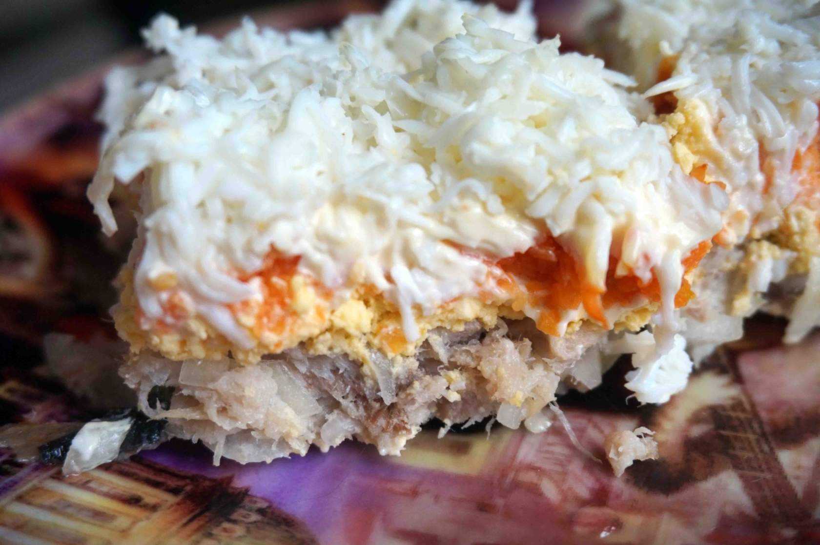 Салат «Снежинка» выкладывают в посудину отдельными слоями.