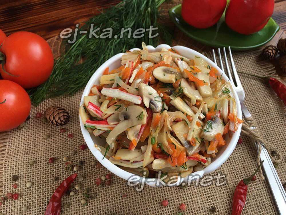 Морковь отвариваем в воде до мягкости. Шампиньоны промываем проточной холодной водой. лук очищаем от шелухи. Крабовые палочки освобождаем от пленки.