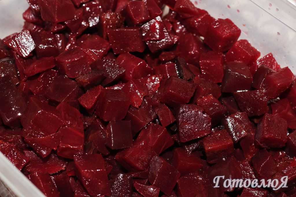 Очистить вареную свеклу и порезать маленькими кубиками.