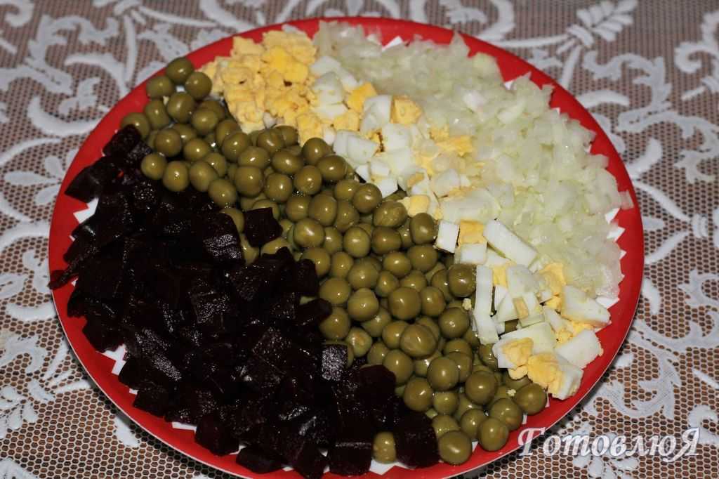 Всем знакомая свекла в данном салате становится «королевой бала», так как подчеркивает вкус сыра и других компонентов. Для салата также понадобится консервированный горошек, соленые огурцы и немного чеснока. Для заправки используется майонез, который при желании можно будет заменить на сметану или йогурт.