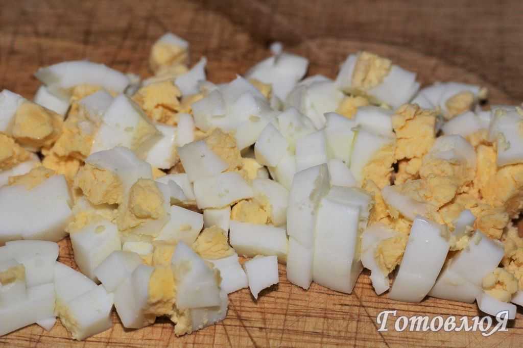 - Яйца почистить и покрошить небольшими кубиками.