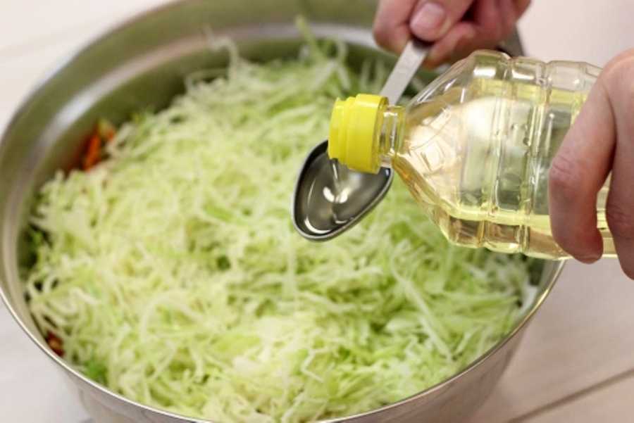 Морковь следует натереть на крупной тёрке (или нарезать очень мелко, но лучше на терке), а капусту мелко нарезать тёркой для капусты. Эти ингредиенты поместите в одну большую миску, посолите и помните руками, чтобы выделился сок.
